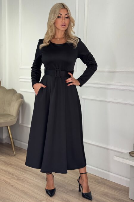 Midi μαύρο φόρεμα με ζώνη μακρυμάνικο