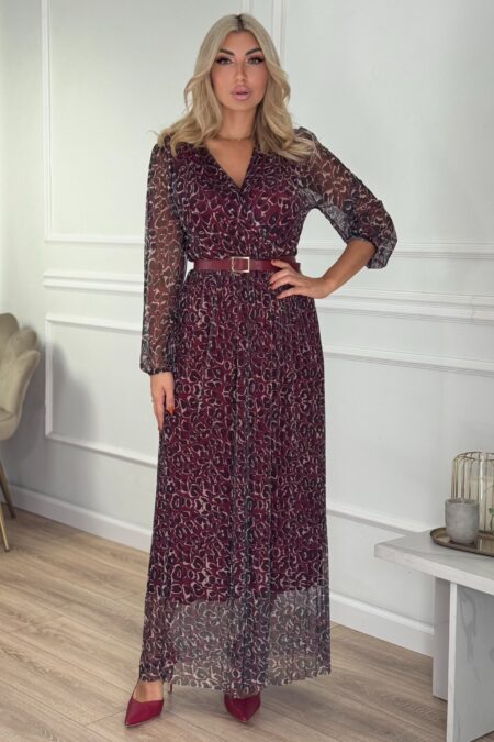 Μάξι μπορντό φλοράλ φόρεμα με κουμπιά και ζώνη