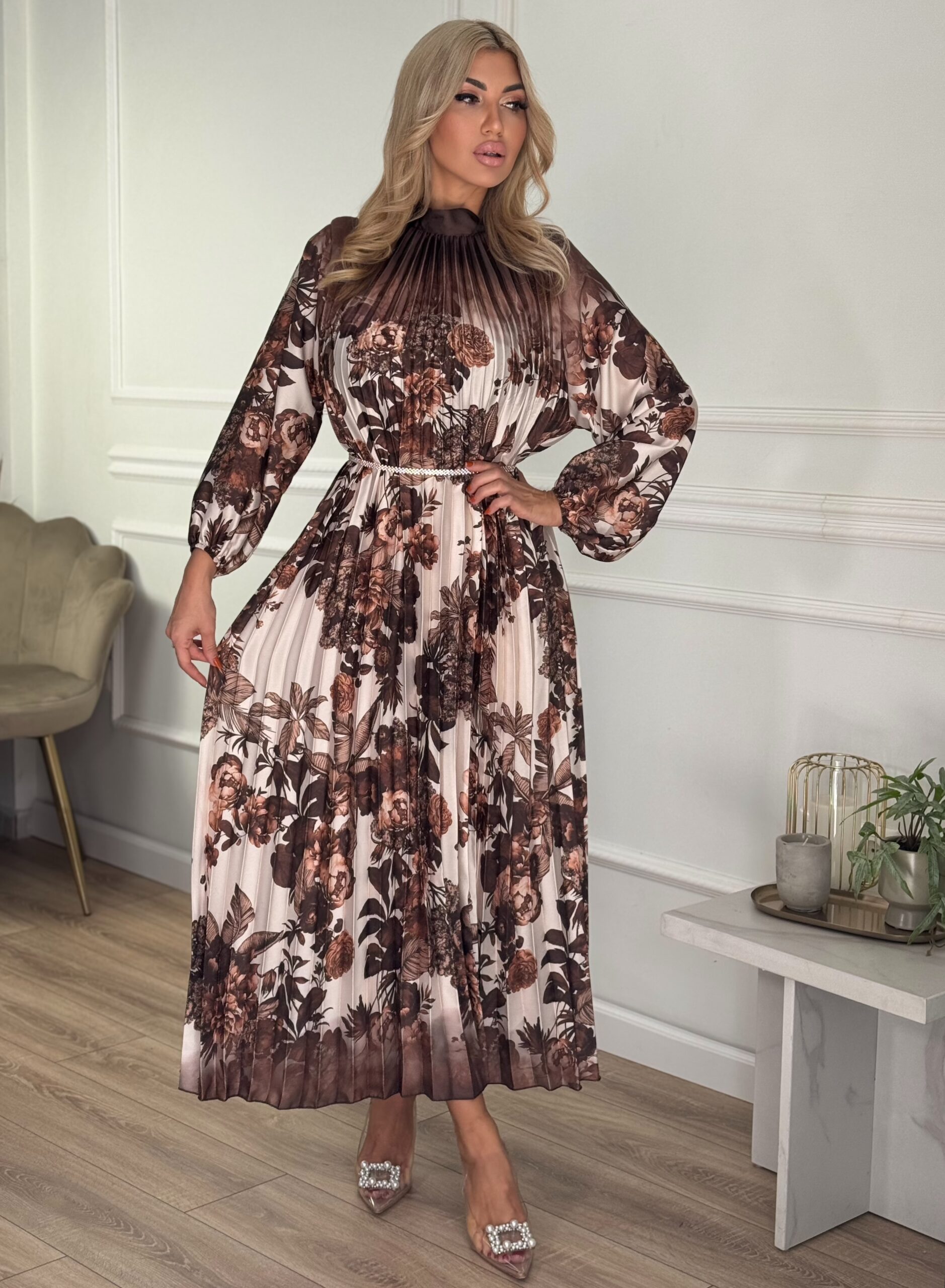 Maxi καφέ floral φόρεμα πλισέ στο κάτω μέρος