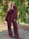 Σετ κουστούμι σακάκι με παντελόνι μαύρο ή μπορντό. Διαθέτει βάτες, σατέν φόδρα εσωτερικά και λάστιχο στην μέση. Ιδανικό για να φορεθεί όλη μέρα.