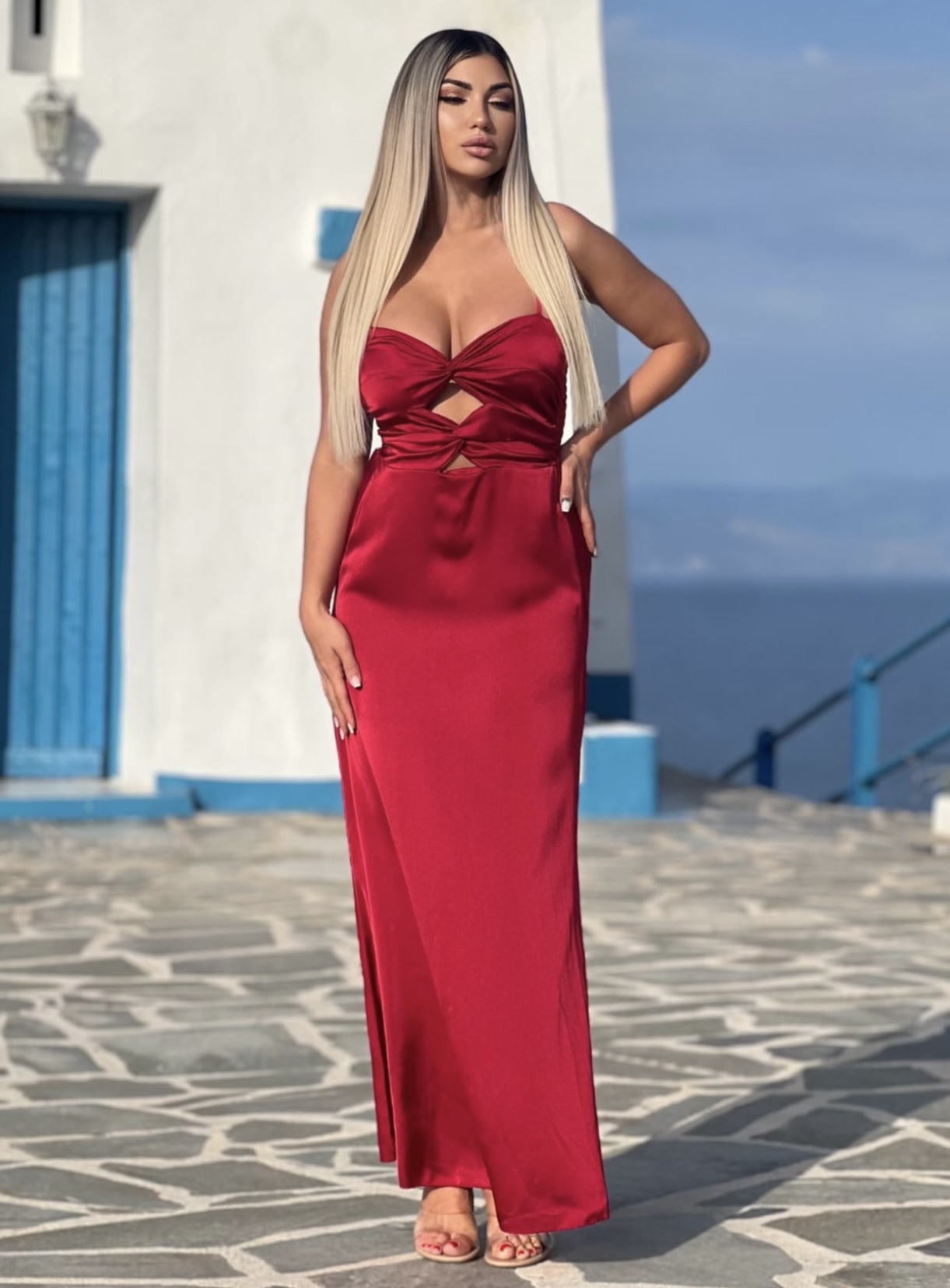 Σατέν μάξι φόρεμα με ανοίγματα μπροστά. Διαθέσιμο σε μπλε, πετρολ και κοκκινο χρώμα. Ιδανικό satin φόρεμα για γάμο ή βάπτιση. Καλοκαιρινό σατέν φόρεμα