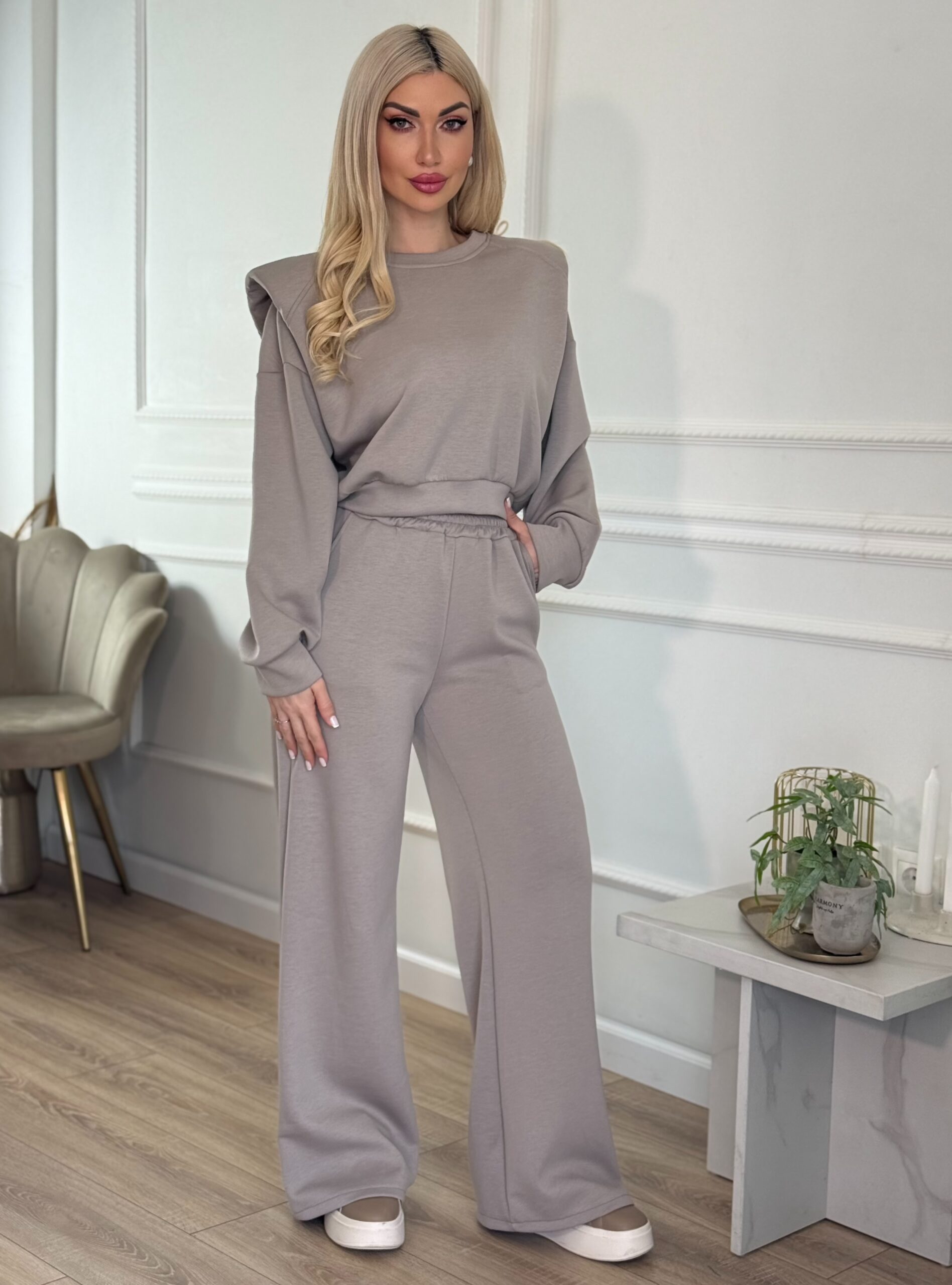 Αθλητικό σετ μπλούζα και παντελόνι με φουσκωτούς ώμους. Διαθέτει λάστιχο στη μέση. Η γραμμή του είναι πολύ άνετη. Ιδανικό για να φορεθεί όλη την ημέρα.