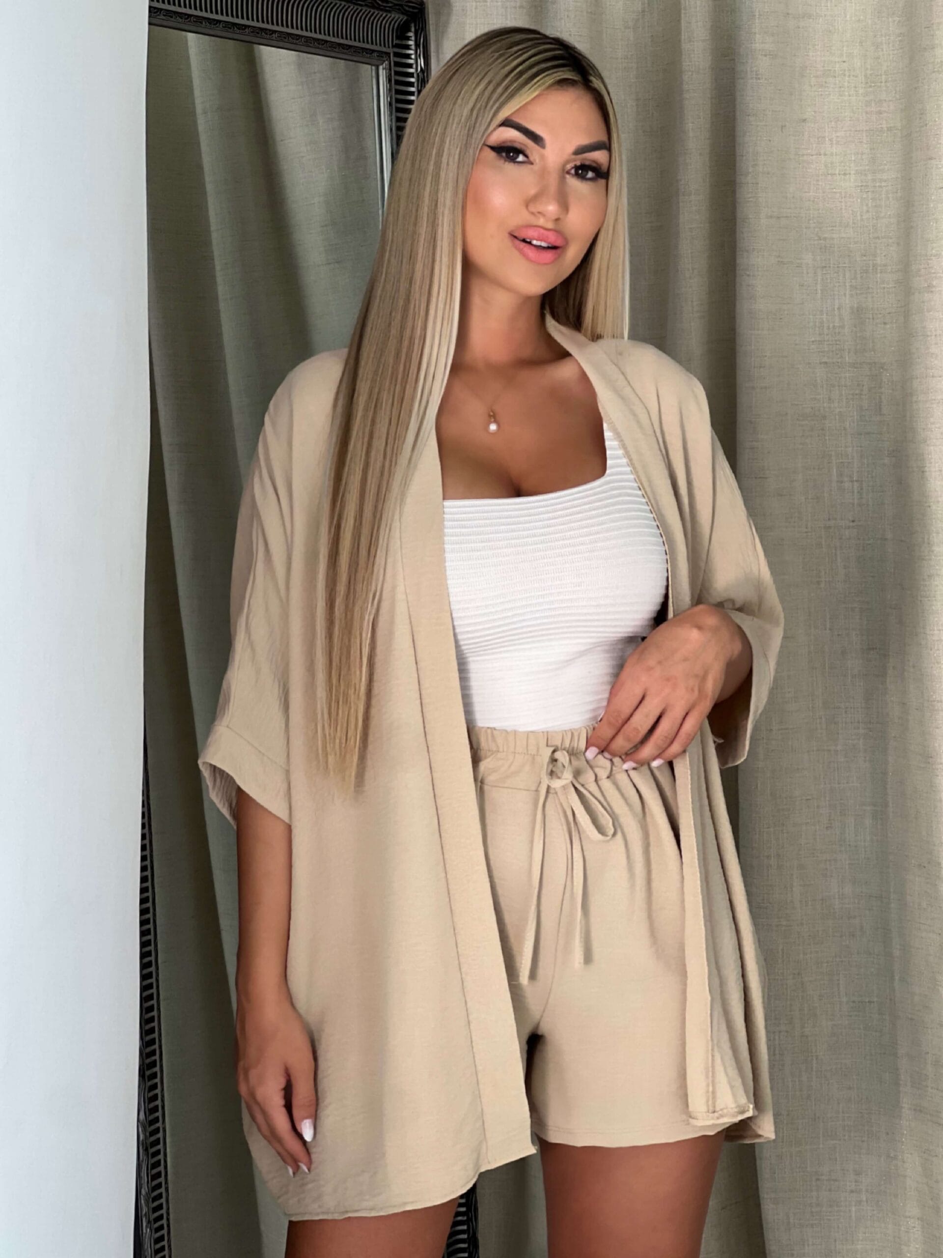 Κιμονό σετ με σορτς. Ανήκει στα καλοκαιρινά γυναικεία σετ σορτς με κιμονό. Καθημερινά γυναικεία σετ σε χρώματα που θα κάνουν άνετο το καλοκαίρι σας
