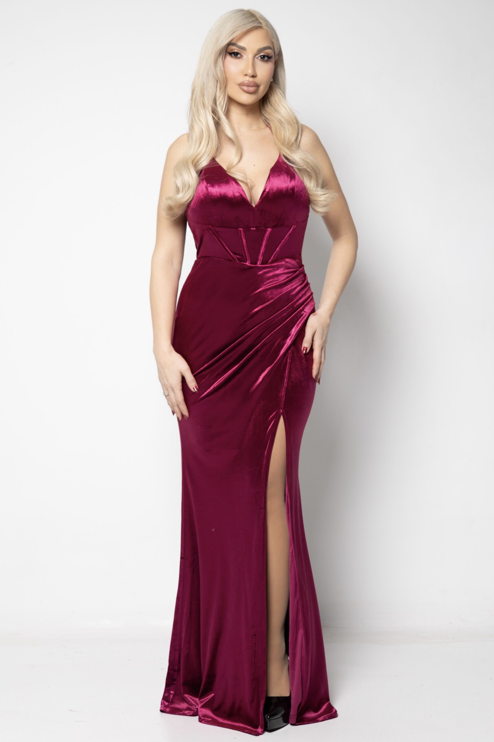 Μάξι μπορντό φόρεμα βελούδινο με σκίσιμο στο πλάι. Διαθέτει ελαστική γραμμή , φερμουάρ,φόδρα και ρυθμιζόμενες τιράντες. Ιδανικό για να φορεθεί σε βραδινή έξοδο.