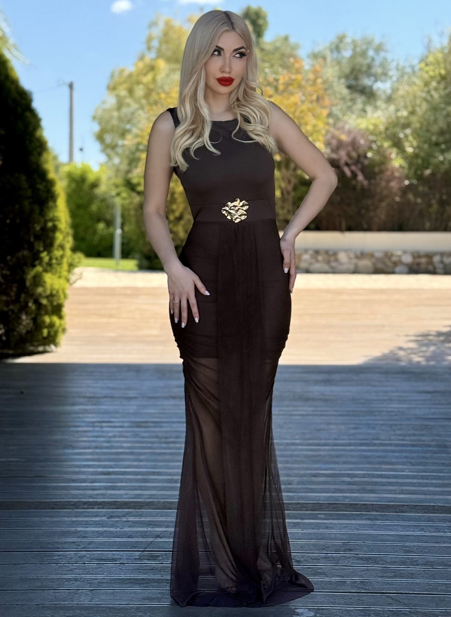 Μάξι καφέ ελαστικό φόρεμα με χρυσή λεπτομέρεια μπροστά