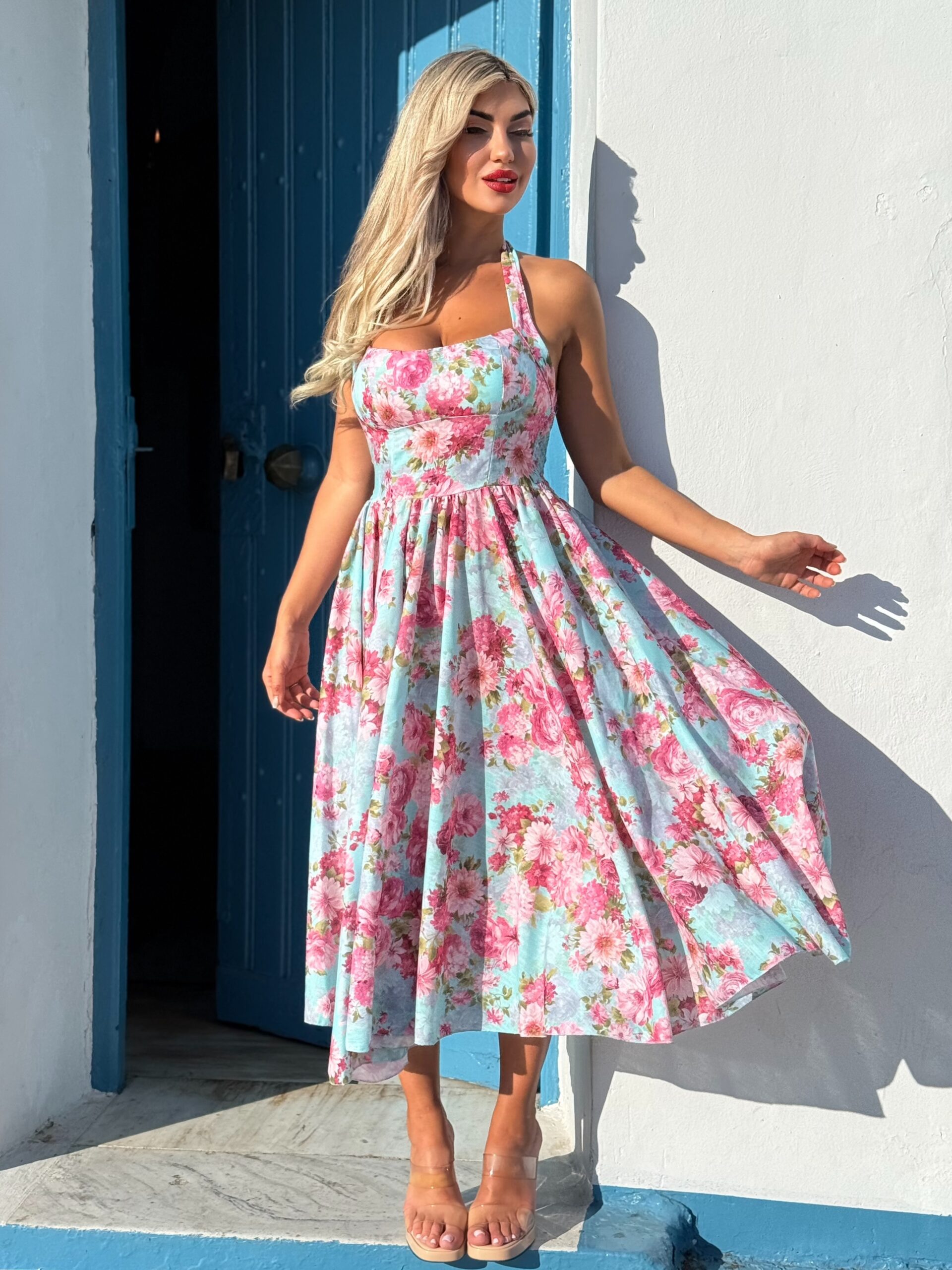 Midi floral φόρεμα με δέσιμο στον λαιμό σε αποχρώσεις.Διαθέτει caps και λάστιχο στο πίσω μέρος της πλάτης.