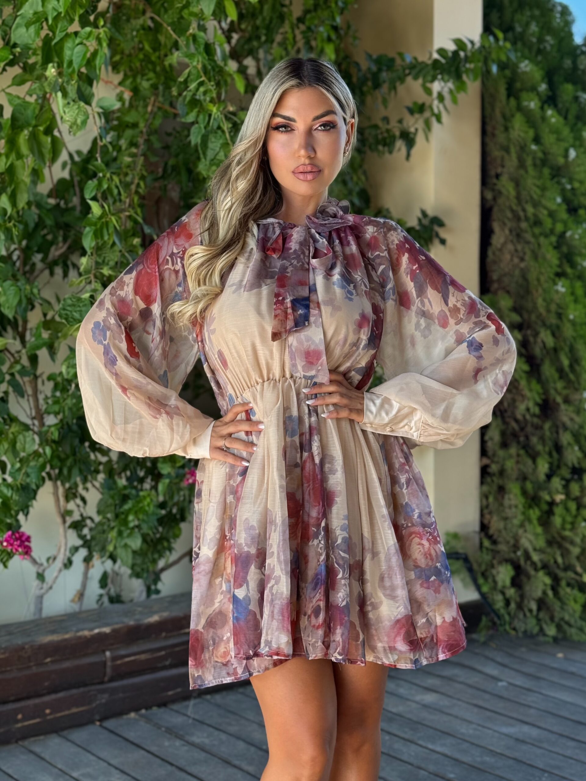 Μίνι μπεζ floral τούλινο φόρεμα. Διαθέτει λάστιχο στην μέση, δέσιμο στον λαιμό και φόδρα εσωτερικά. Ιδανικό για γάμο ή βάπτιση.