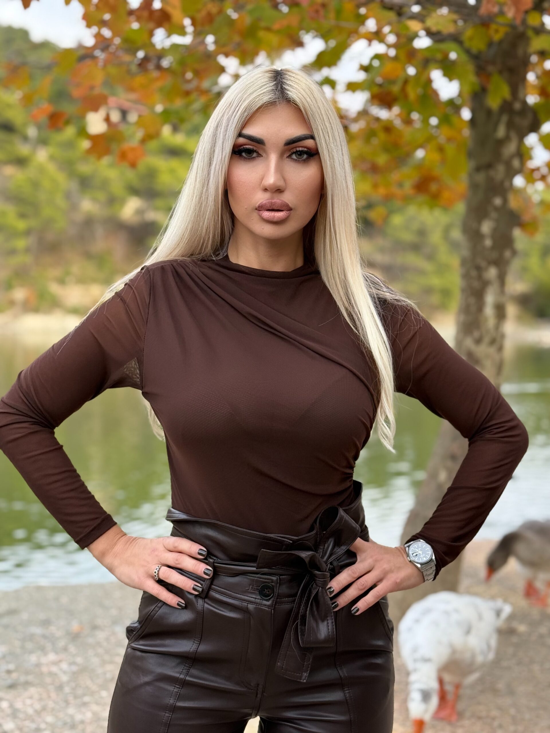 Καφέ ελαστικό κορμάκι see through με διπλό ύφασμα για να μη διαφανίζει. Διαθέσιμο σε 2 μεγέθη. Διαθέτει ελαστική, άνετη γραμμή.