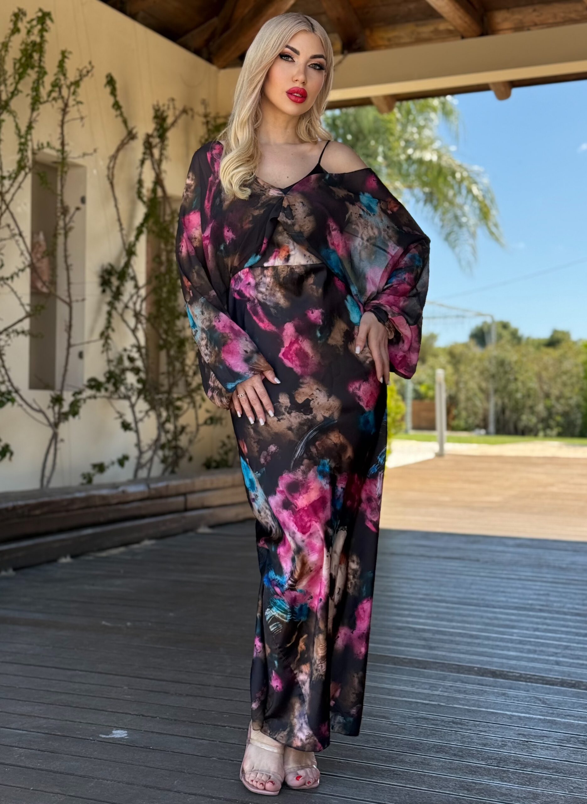 Σατέν μάξι μαύρο εμπριμέ φόρεμα με μπολερό